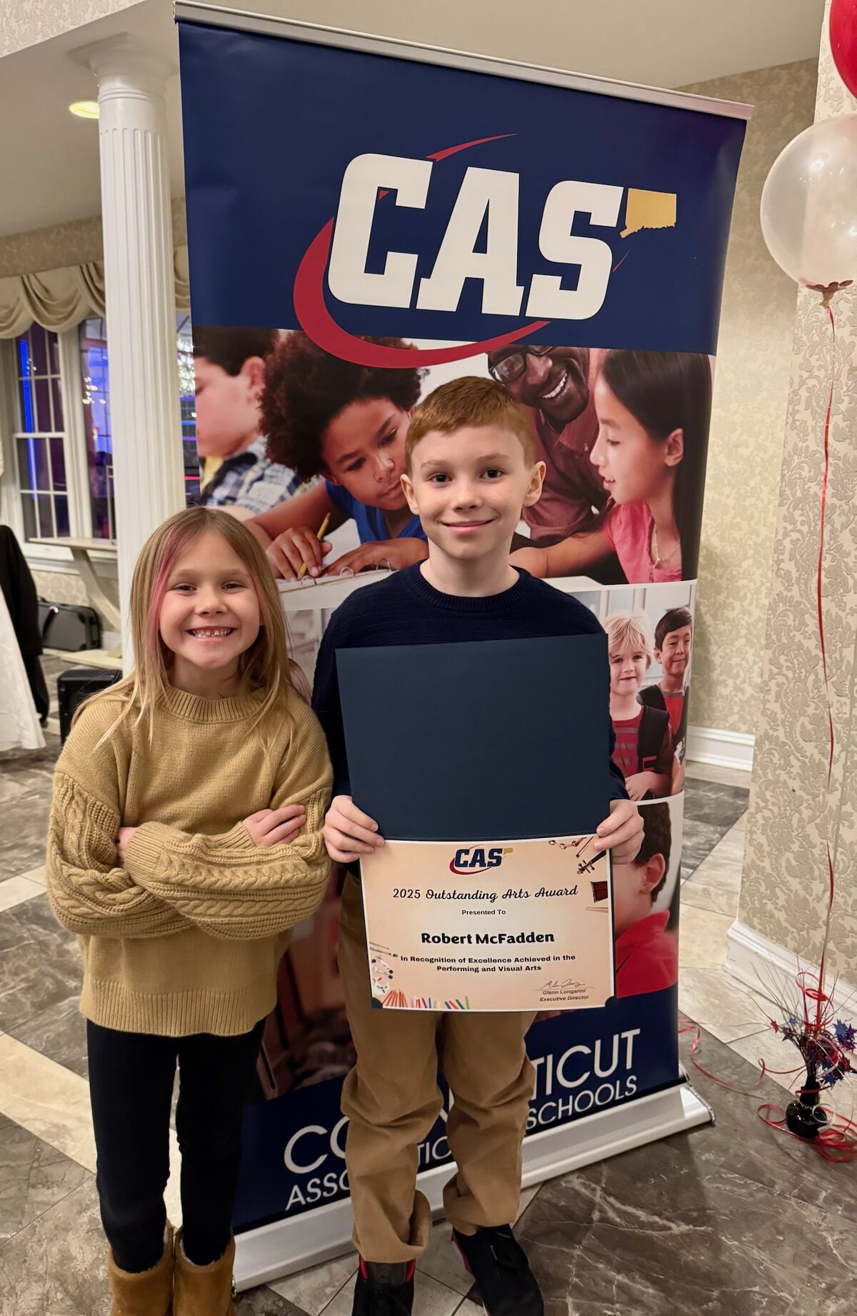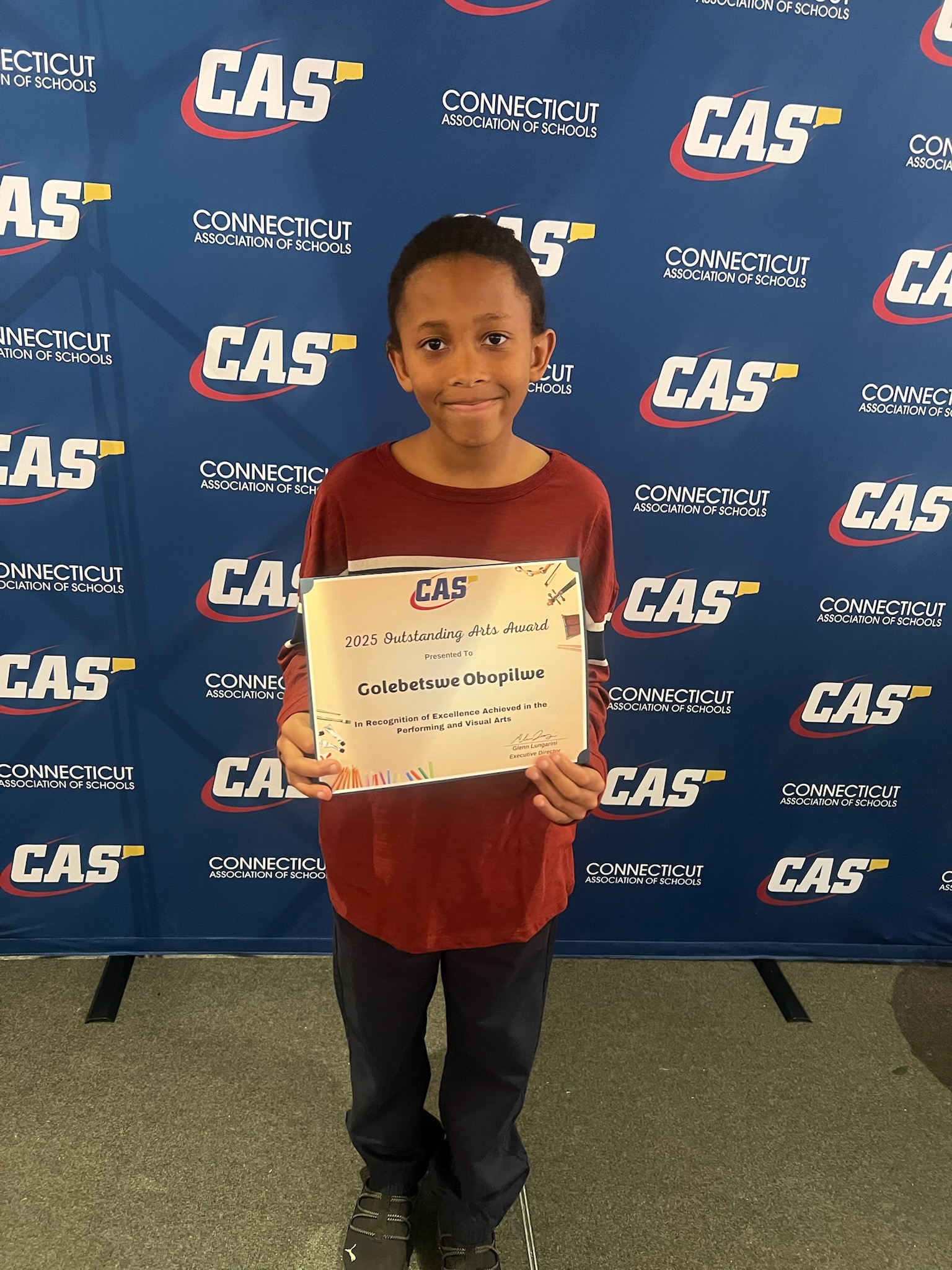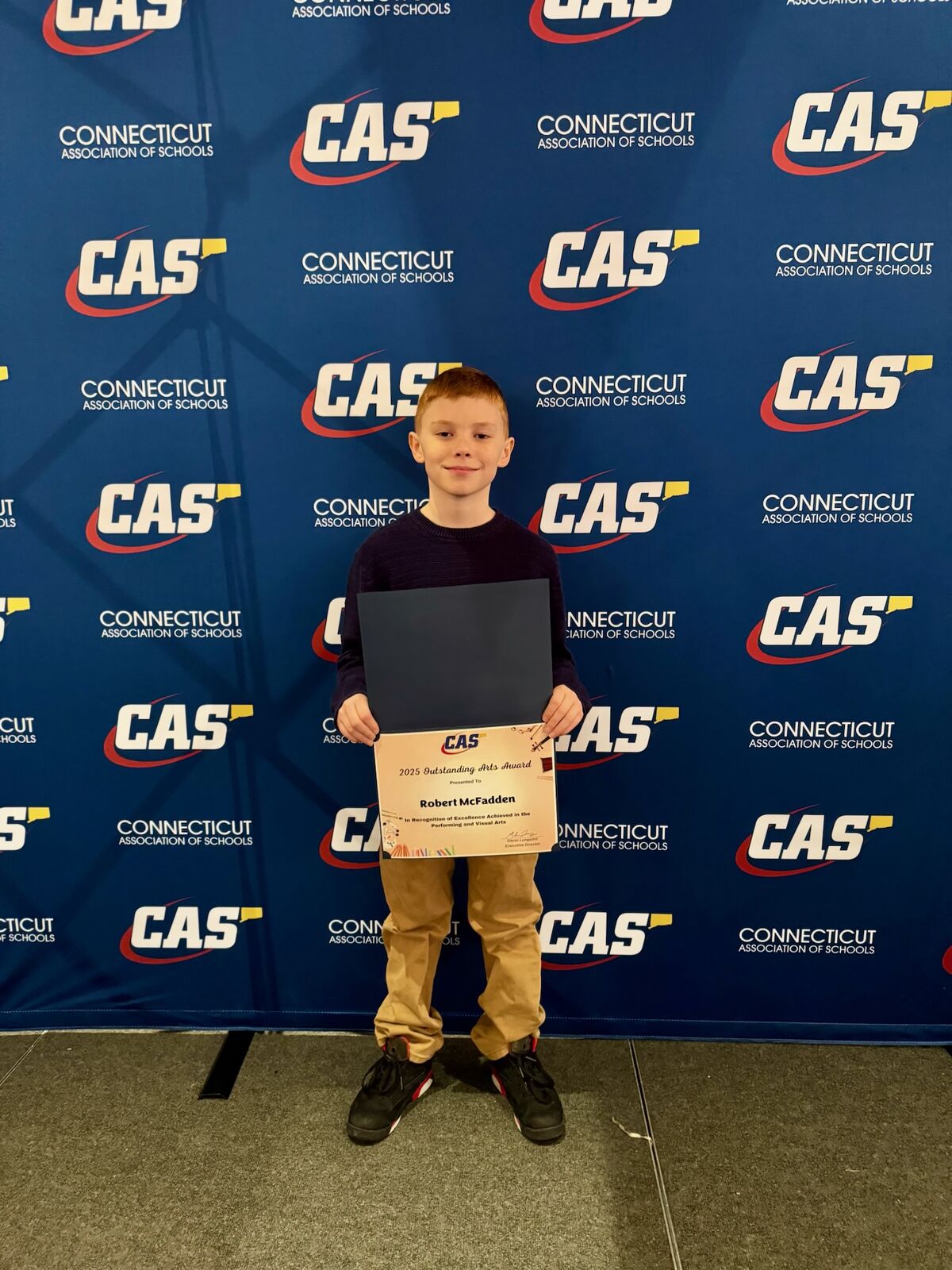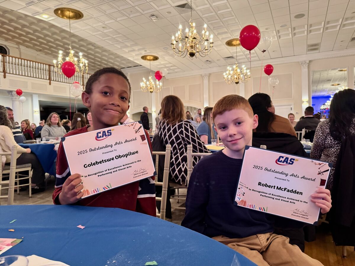 We are very proud to share that two of our 5th graders, Robbie McFadden, in Mrs. Oakes' class and Golebetswe Obopilwe, in Miss Fitzpatrick's class, were recognized last night at the Connecticut Association of Schools 26th annual Celebration of the Arts banquet. This annual event, held at the Aqua Turf in Southington, recognizes two students per school who are excelling in the arts! We are very proud of their hard work and dedication to becoming well rounded and talented learners, artists and musicians!